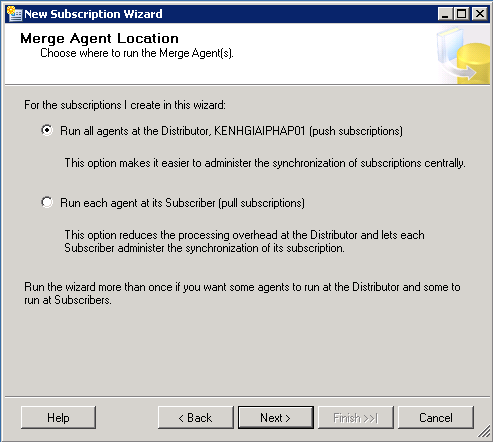 Chú ý: Nếu bạn chọn chế độ Transactional puplication thì dữ liệu sẽ được đồng bộ theo 1 chiều, tức là server 1 cập nhật dữ liệu thì server 2 cũng sẽ có dữ liệu . Tuy nhiên ngược lại thì không được. Còn chế độ Merge Puplication sẽ đồng bộ dữ liệu theo cả 2 chiều.